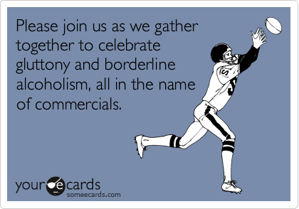 3. Because people who might not normally watch sports might watch the Super Bowl game, we have to explain football through bad sports analogies or statements of the bloody obvious. I was throughly confused by a comparison of the SB game to basketball (maybe it’s because teams in both sports want to win?). “Well, what the defensive really wants to do here is keep the other team from scoring, Bob.” “Thanks, Jim. Both teams are really under pressure here. The Super Bowl is like the Olympics of football.” #EducateTheMasses