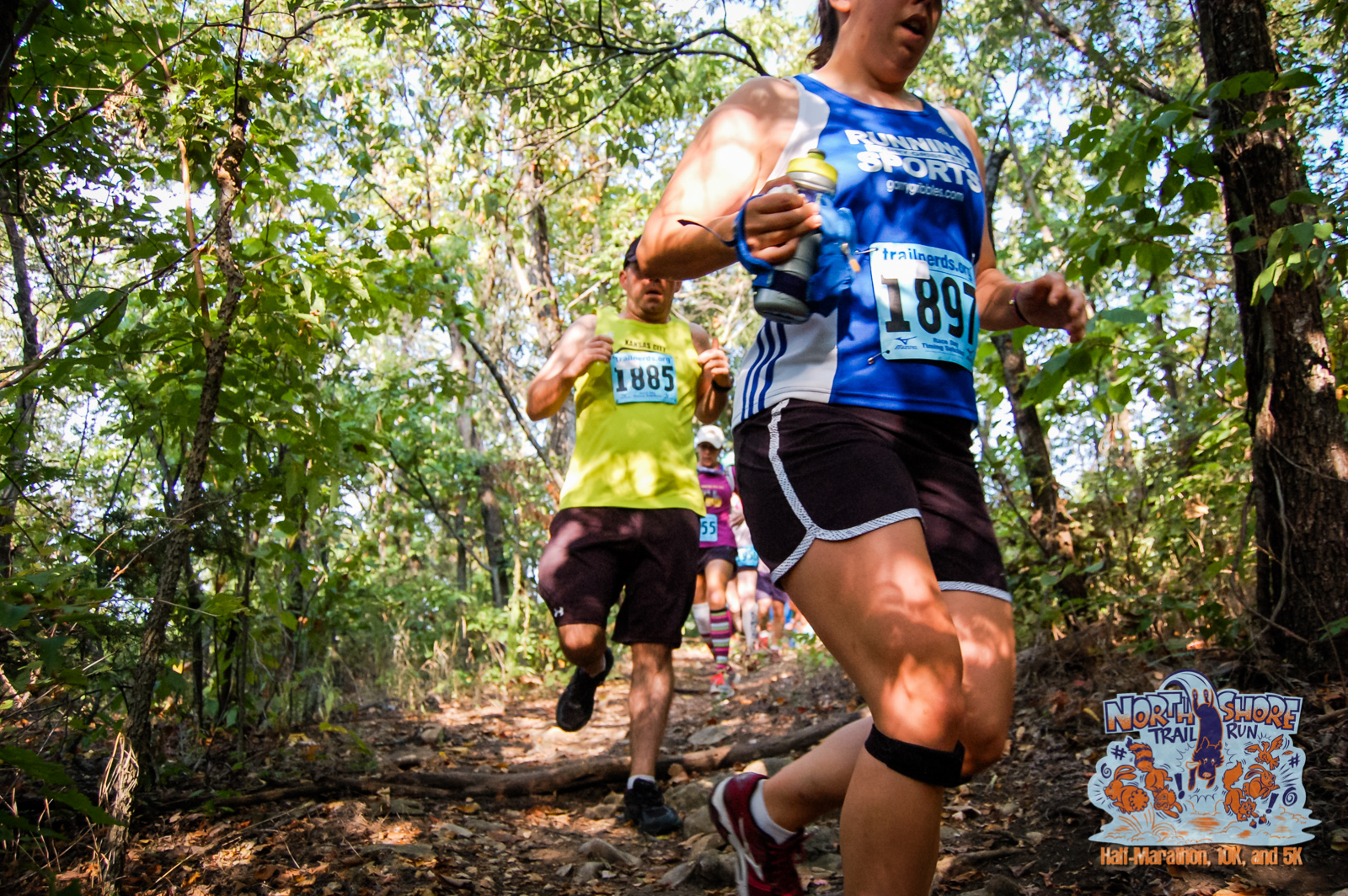By 9am start time, it’s already well into the 80s, probably will be a heat index of almost 100 by the time we’re done. The sun is beating down. The lake breeze is as dead as my feet will soon be. The gorgeous wooded trails are what they call “technical trails.” Technical being the Trail Nerd term for “lots of freakin shit for you to climb and trip over.” The inviting shade is suddenly a suffocating canopy of humidity. Rocks, roots, branches, uneven terrain, and giant spiders are out to get you. Every muscle in your lower body will be used today. And maybe your arms too – brushing a branch out of the way or hoping to God that spiderweb was empty.