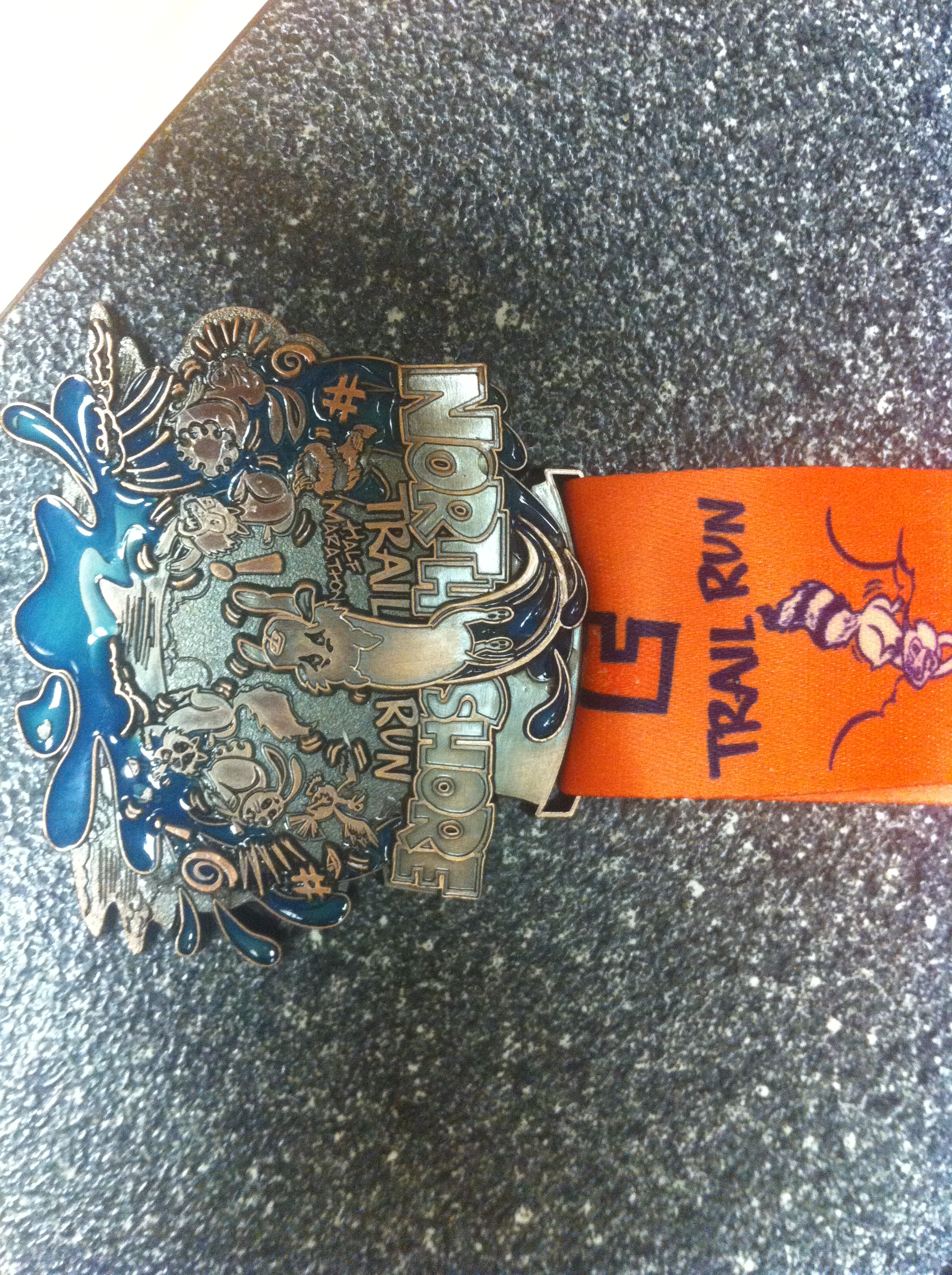 The was this awesome bronzy rendition of the race logo with this cool blue shellack stuff in the water part. Even the ribbon is a work of art! Only the Half Marathon finishers got a medal.
