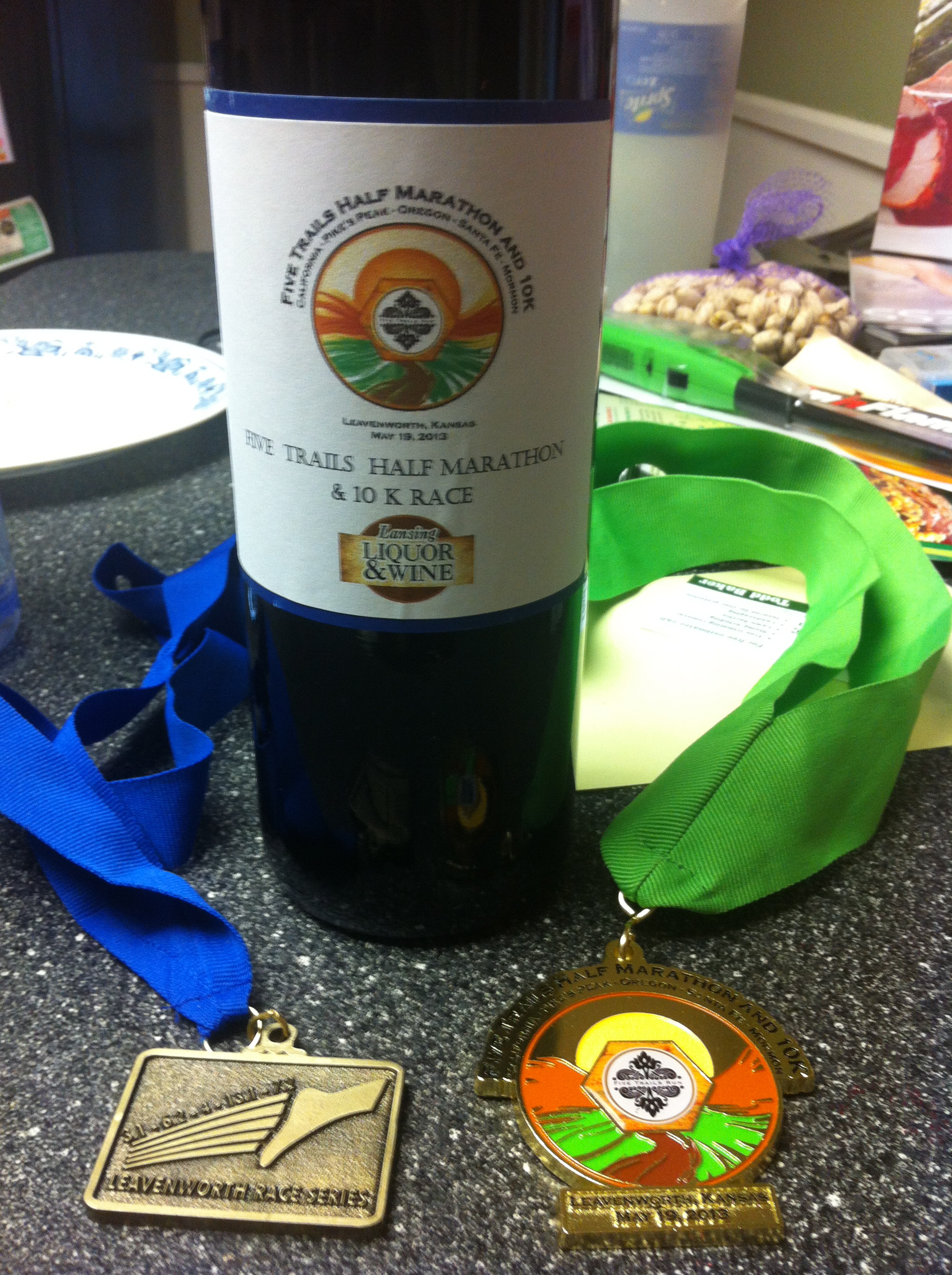 On the left, our finisher medal for completing the Leavenworth Race Series that started in Aug 2012. The wine was for 3rd place in my age group. And then the colorful finisher medal for the half marathon on the right.